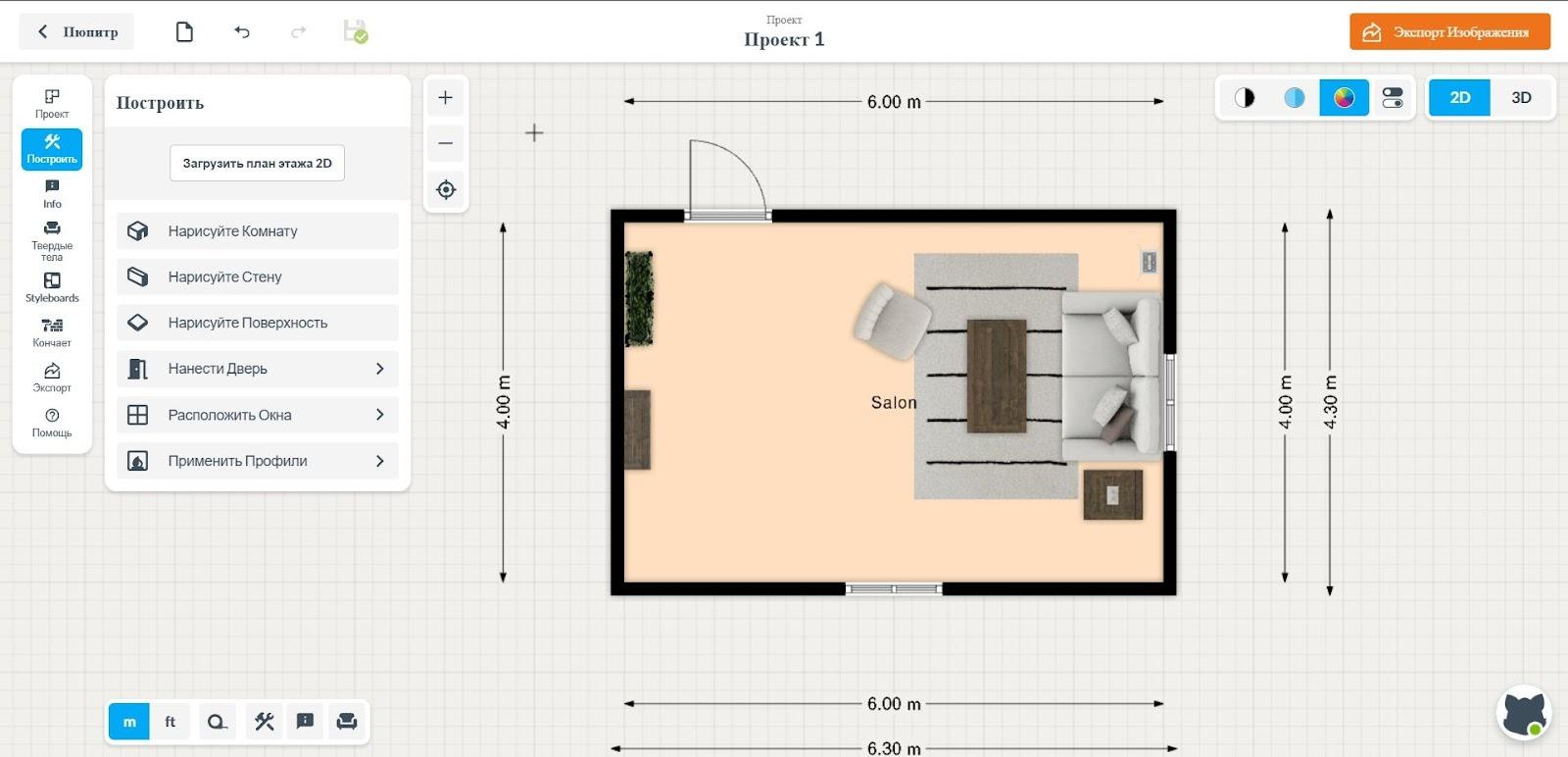 Здесь можно нарисовать комнату самостоятельно и на основе чертежа. Еще есть конструктор, который позволяет создать готовый дизайн за 3 шага: укажите форму помещения, его параметры и выберите стиль из 15+ вариантов. После вы легко измените планировку, внутреннюю отделку и материал предметов. Кроме двухмерного плана, есть трехмерный: в этом режиме можно прогуляться по будущей квартире. Однако функция 3D-визитов платная. Единственная сложность: сервис не переведен на русский язык.