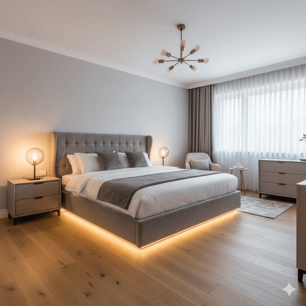 Выбирайте модели, которые станут не просто источником света, а элементом декора. Купите напольные торшеры, настенные бра, настольные лампы и ночники — в зависимости от того, что будет уместно в интерьере. Продумайте многоуровневый световой сценарий: общее освещение, по зонам и декоративное, которое подсвечивает красивые детали интерьера — ниши, полки, картины.