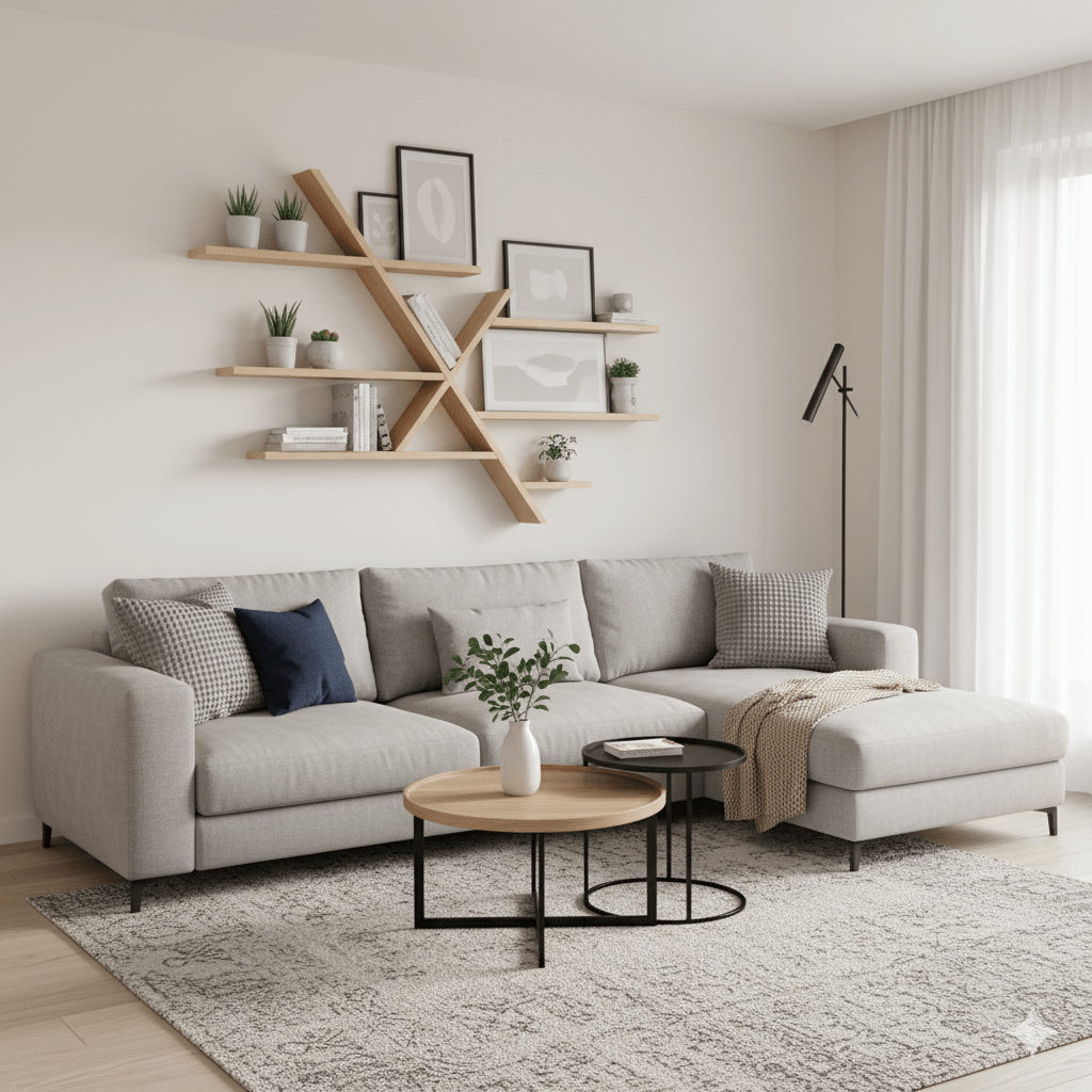 - Композиция из полок. Соберите несколько полок разного размера в оригинальную композицию. Расположите их симметрично, лесенкой или хаотично.