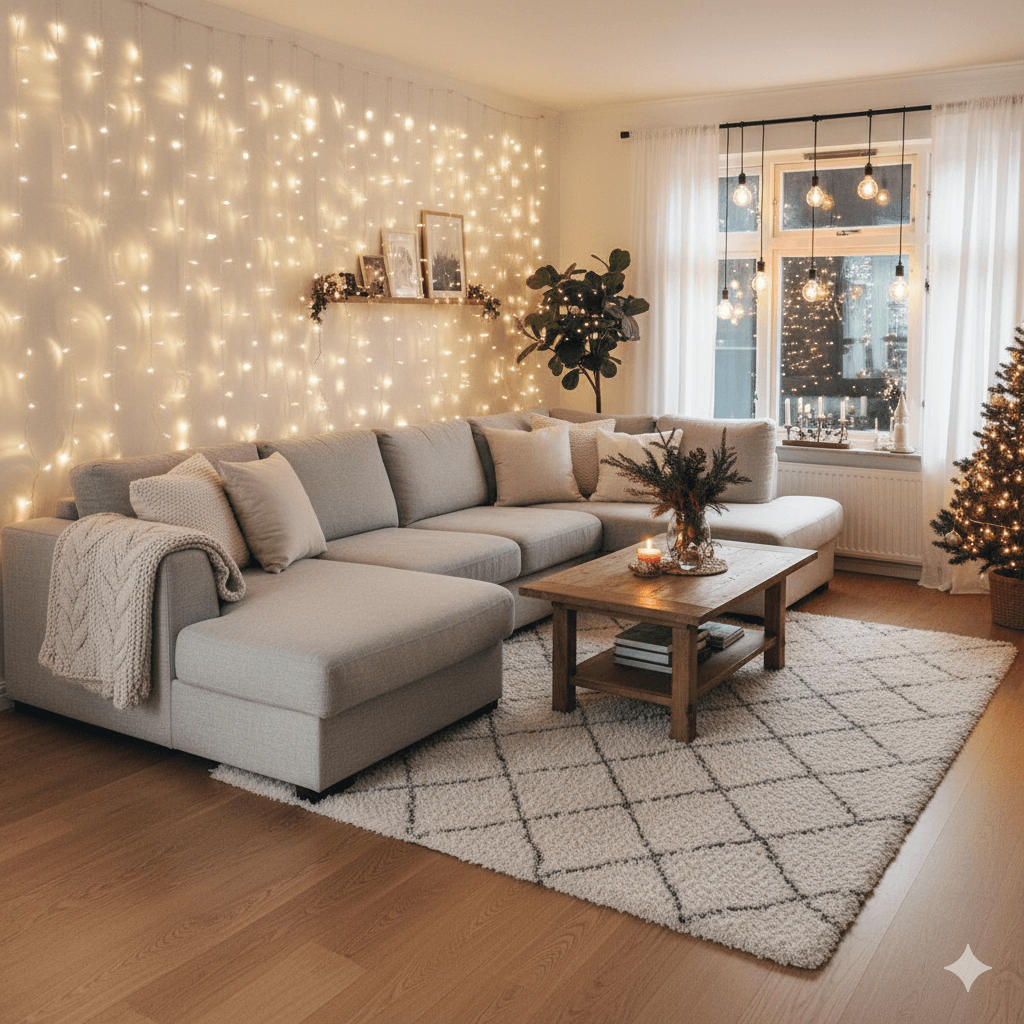 Используйте электрические гирлянды не только на Новый год. Они создадут мягкую и волшебную атмосферу в комнате. Выбирайте лампочки с желтоватым свечением: они мягче, теплее, живее. Еще можно сделать украшения для комнаты своими руками — гирлянды из флажков или помпонов.