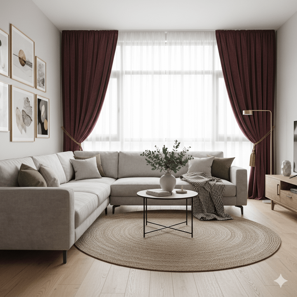 Хотите легкости? Возьмите лен, хлопок или вуал, которые струятся. Еще подойдут римские шторы или японские панели: минимум ткани, максимум воздуха. Нужно добавить больше уюта? Выбирайте бархат или плотный лен. Любите современный стиль? Вам подойдут рулонные шторы или однотонные портьеры без кружев и складок.