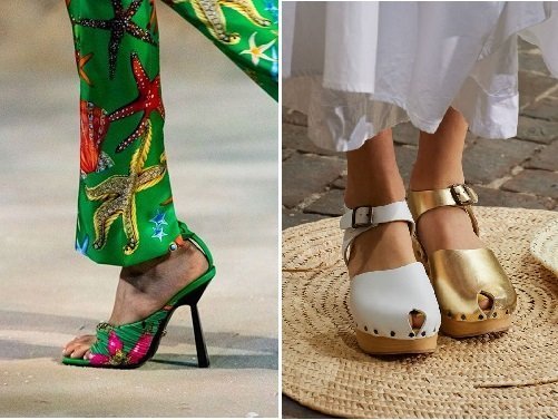 Высота и форма каблука также варьируется: в моде плоская подошва и платформа, танкетка и микро-каблук, т-образная устойчивая форма и массивный треугольник или трапеция, а также романтичная шпилька. Не менее популярны подошвы из натуральных материалов, в первую очередь из дерева, которые зачастую украшены изящной резьбой. Верх может быть изготовлен из чего угодно: натуральной кожи, ткани и даже прозрачного пластика.